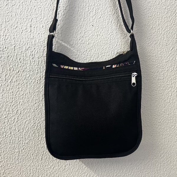 Le sac bandoulière Aglou noir et toile Euphoria . Il a une poche de chaque coté zippées. La grande poche centrale possède aussi une grande fermeture. L’anse en tissu est réglable (130cm).