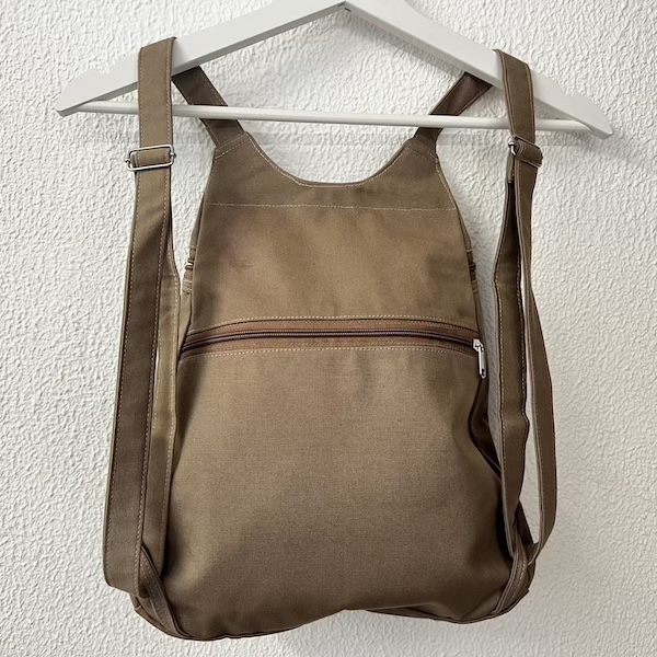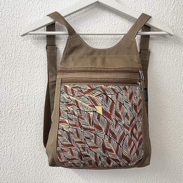 Petit sac à dos beige et toile Chaman . Il a une petite poche sur le devant mais aussi une grande poche centrale avec toutes deux une fermeture.