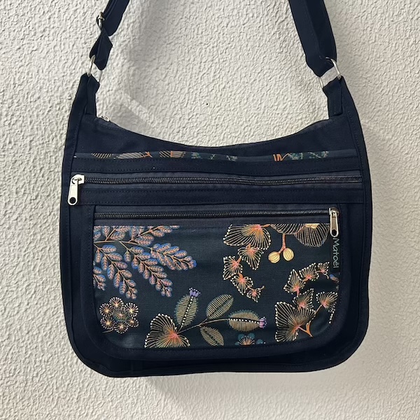 Le sac bandoulière Maëlle fabriqué en tissu marine et toile Phoenix . Il a deux poches d’un coté et une de l’autre toutes zippées. La grande poche centrale possède aussi une grande fermeture. L’anse en tissu est réglable (130cm).