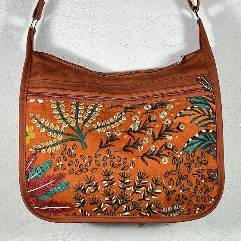 Le sac bandoulière Maëlle fabriqué en toile orange et world . Il a deux poches d’un coté et une de l’autre toutes zippées. La grande poche centrale possède aussi une grande fermeture. L’anse en tissu est réglable (130cm).